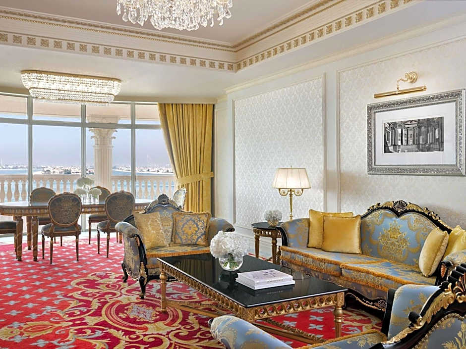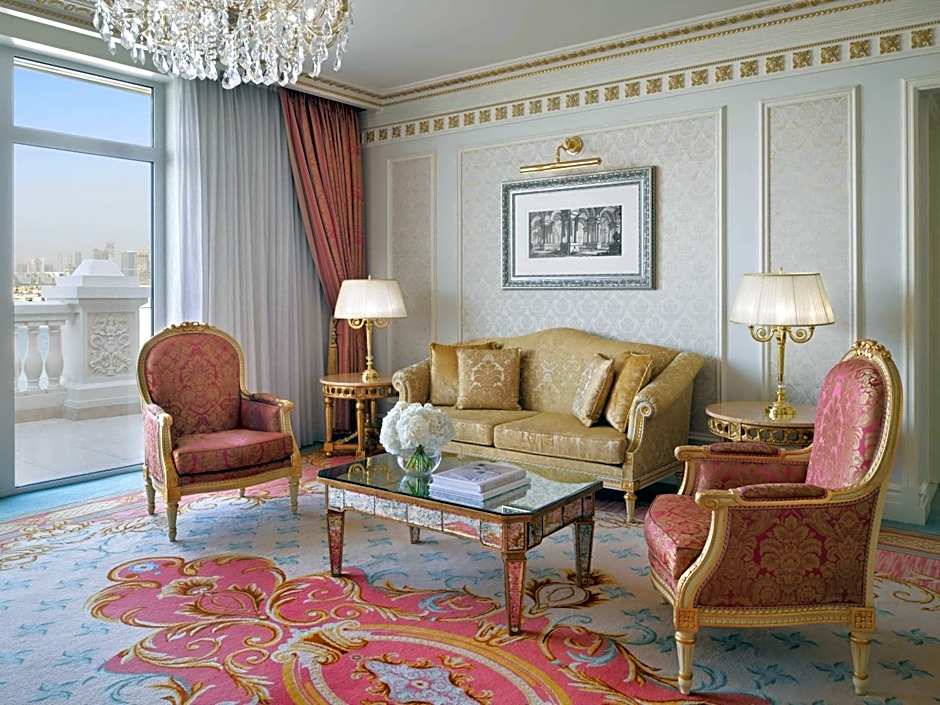 This suite has a balcony, seating area and dining area.
